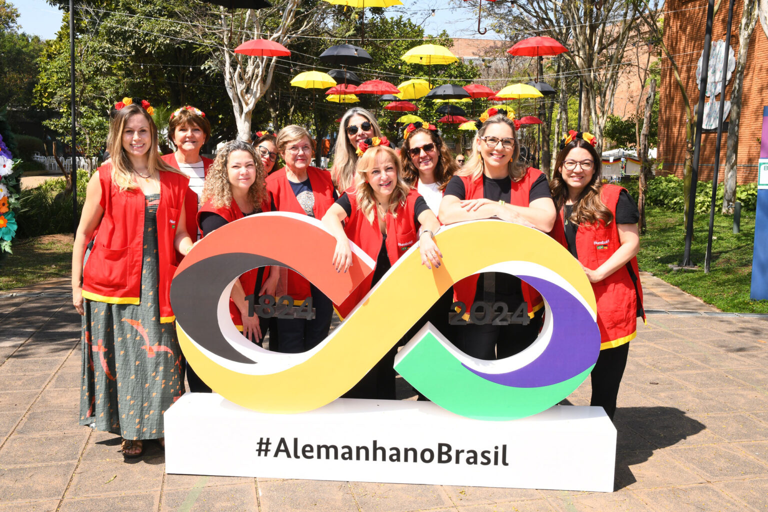 Alegria, apresentações de danças folclóricas, músicas tradicionais, choppe gelado, comidas típicas, famílias reunidas, reencontros de ex-alunos, crianças se divertindo, um sol lindo, um dia feliz.